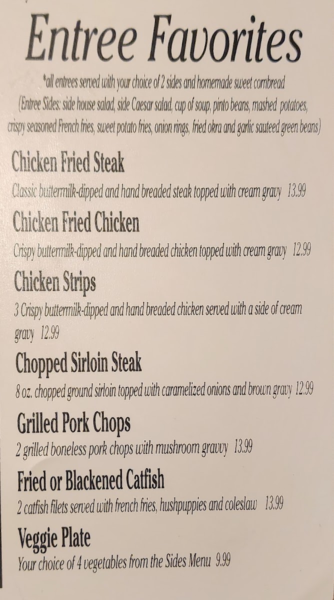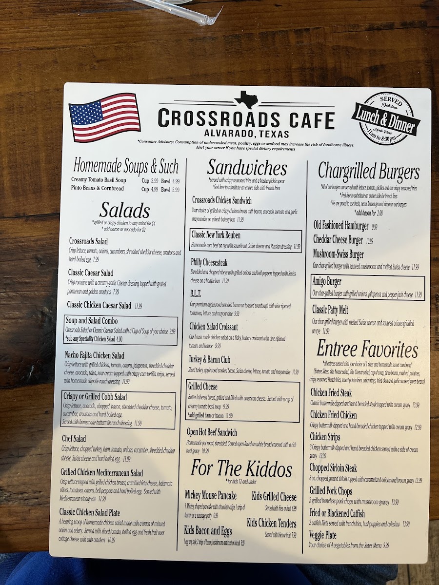 For lunch, the Entrée Favorites include dishes like the Chopped Sirloin Steak, Fried Catfish, and Chicken Fried Chicken. There are also comfort-food staples like Chicken Fried Steak and Chicken Strips, perfect for those craving a filling, flavorful meal. If you’re in the mood for something a bit lighter, there are plenty of Salads, such as the Crispy Chicken Cobb Salad and Grilled Chicken Mediterranean Salad, as well as the hearty Crossroads Salad and Chef Salad.